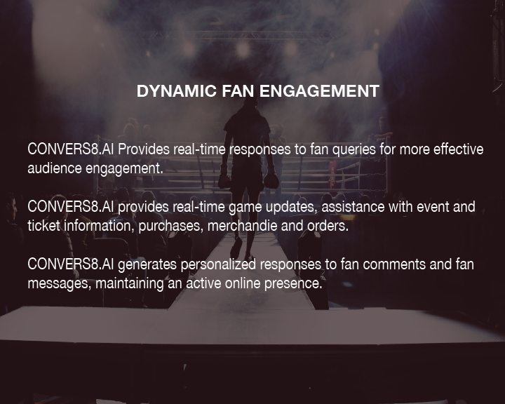 CONVERS8.AI revolutionizes the way sports teams, athletes, fans, and brands interact by providing personalized, engaging, and data-driven experiences, designed to simulate human conversation. We provide instant answers to fans’ questions, help with ticket purchases, merchandise sales, and other club-related services.